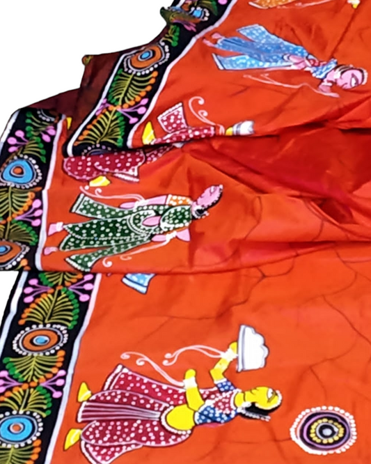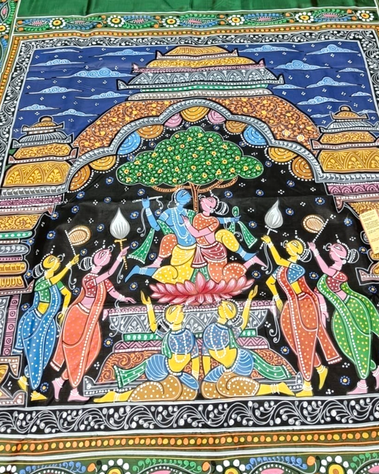 Pattachitra hand-painted sarees By Ranga Chakra are a beautiful and artistic form of traditional Indian attire that incorporates hand-painted designs inspired by regional folklore, cultural stories, or traditional motifs. These sarees showcase the artistry and creativity of skilled artisans and often serve as a canvas for storytelling through intricate and vibrant paintings. Here are some key characteristics of Folklore