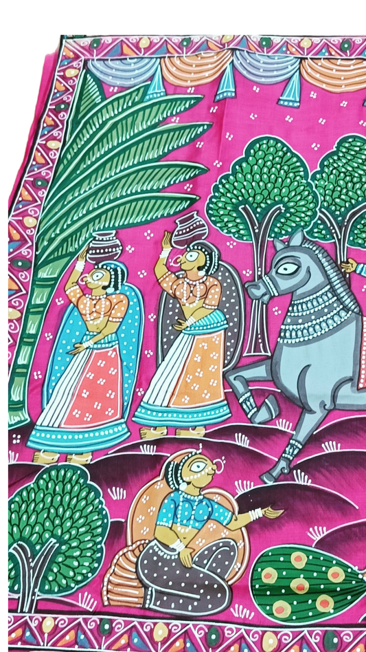 Pattachitra hand-painted sarees By Ranga Chakra are a beautiful and artistic form of traditional Indian attire that incorporates hand-painted designs inspired by regional folklore, cultural stories, or traditional motifs. These sarees showcase the artistry and creativity of skilled artisans and often serve as a canvas for storytelling through intricate and vibrant paintings. Here are some key characteristics of Folklore