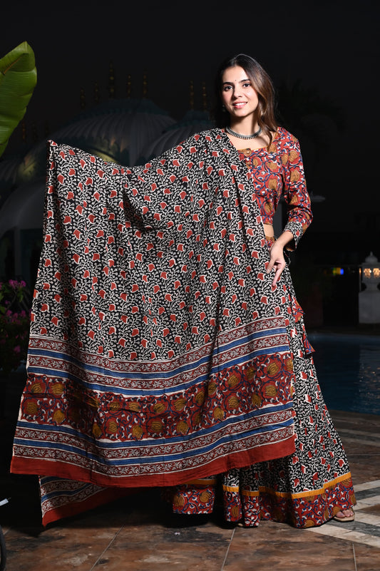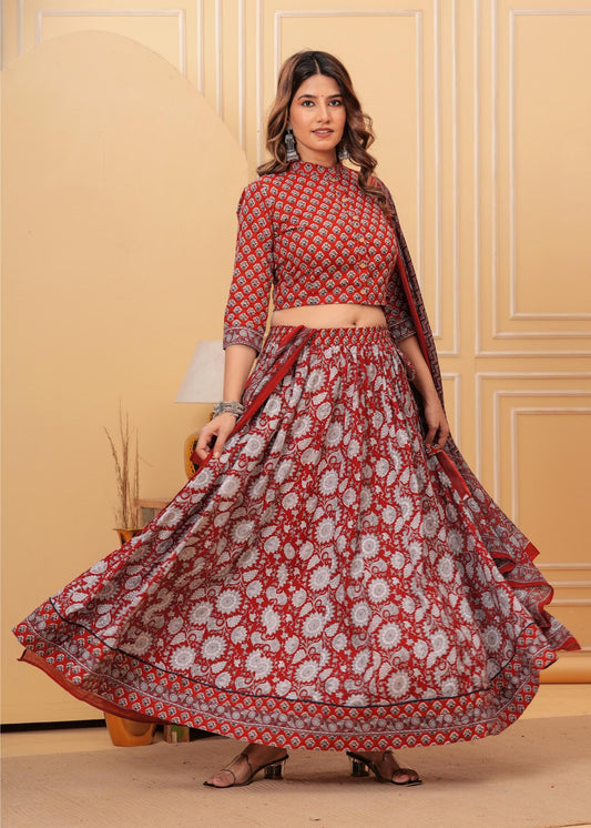 Matte Red Mul Cotton Lehenga Set with Block prints