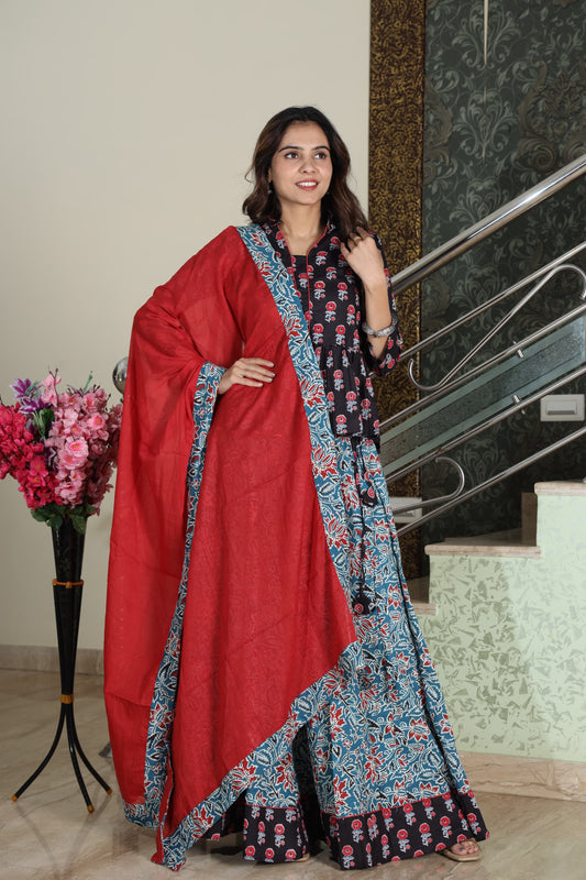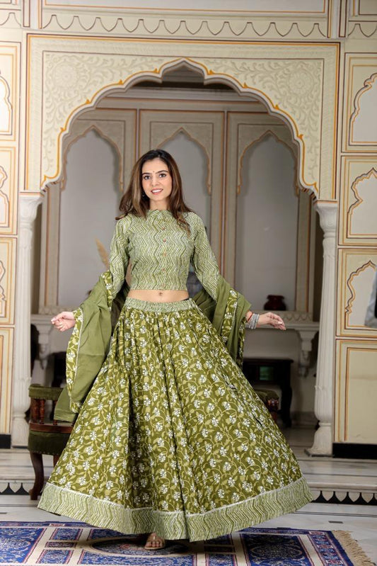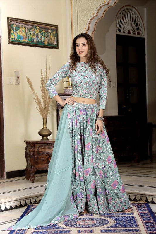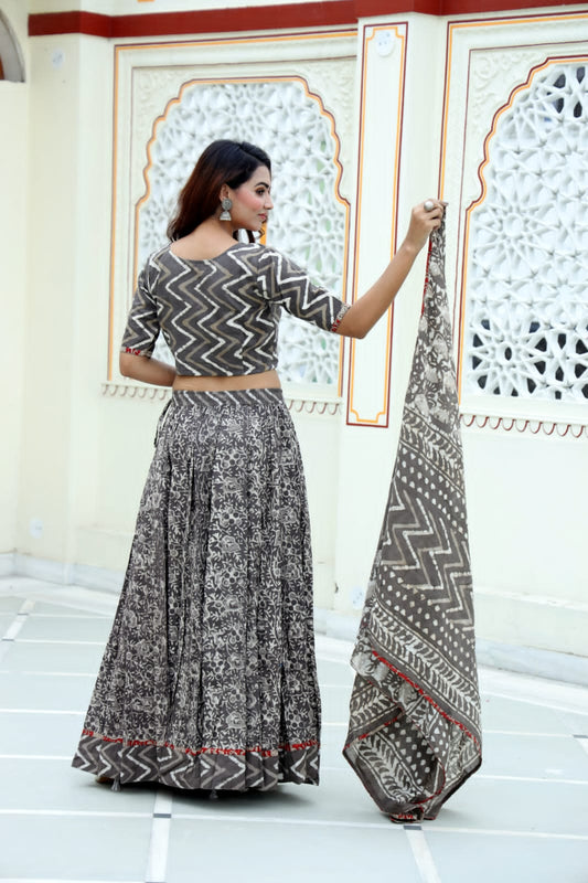 Mul Mul Cotton block printed Lehengas. Mul mul cotton Lehenga set neutral shade Block printed designs.