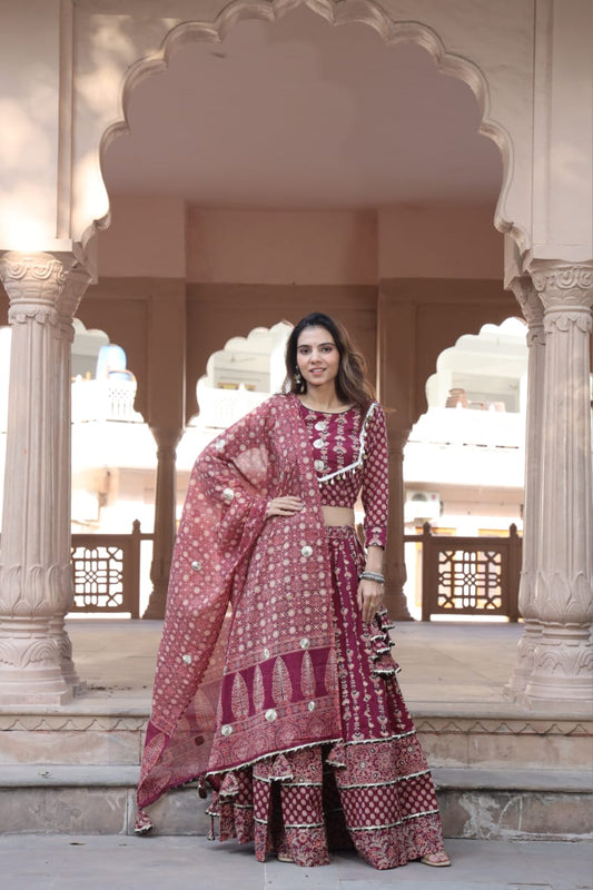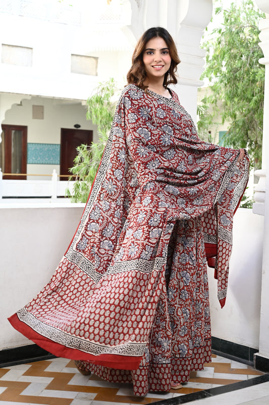 Burgundy Mul Cotton Lehenga Set with Block prints