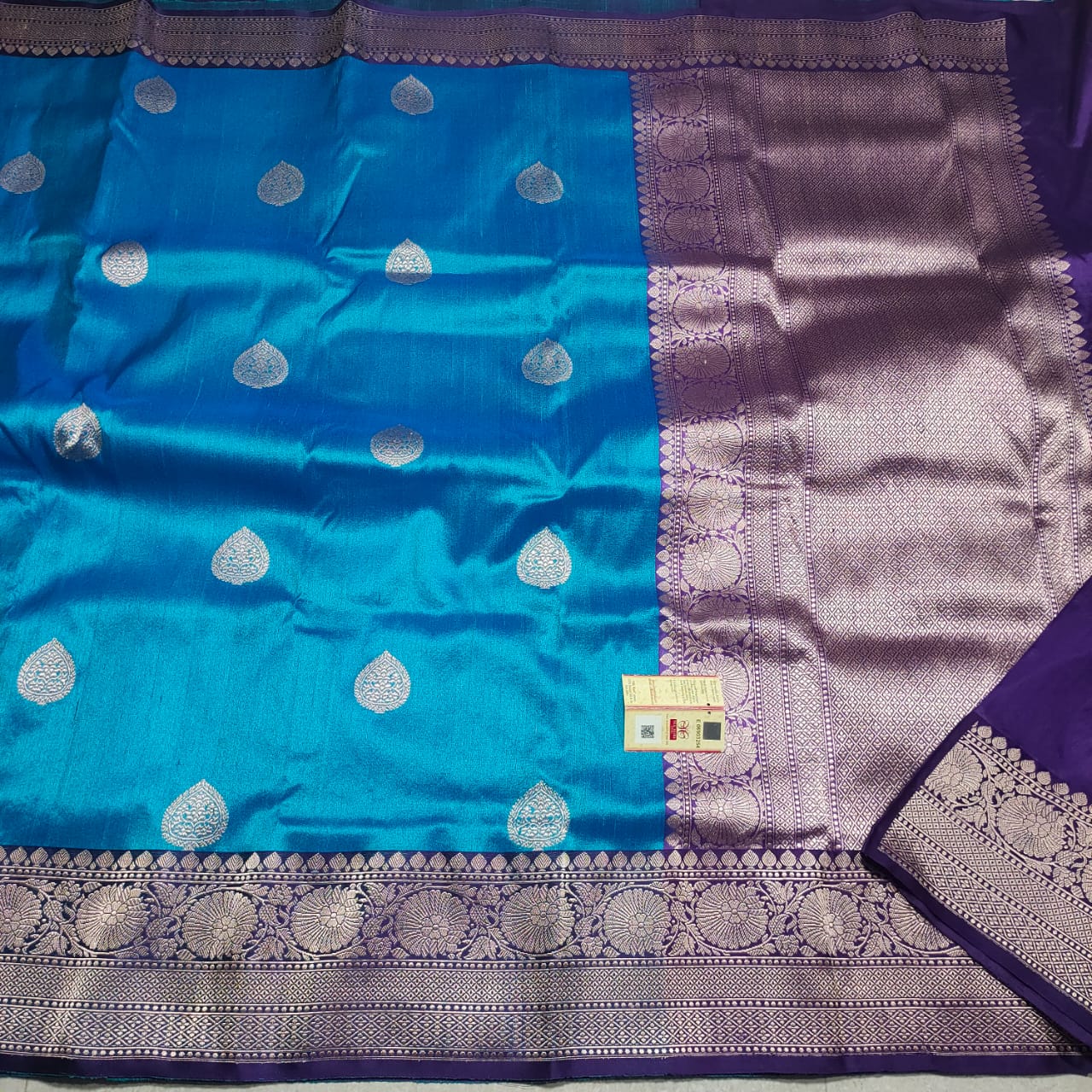 Beautiful One of a kind Azure blue Banarasi tussar silk saree with antique zari weave. Expertly handcrafted in the traditional Banarasi style, this luxurious bridal silk saree boasts a delicate antique zari weave that adds a touch of opulence to any occasion. With its fine craftsmanship and elegant design, this saree is sure to make a statement and elevate your wardrobe. Experience the beauty and quality of true Banarasi silk with this stunning piece.