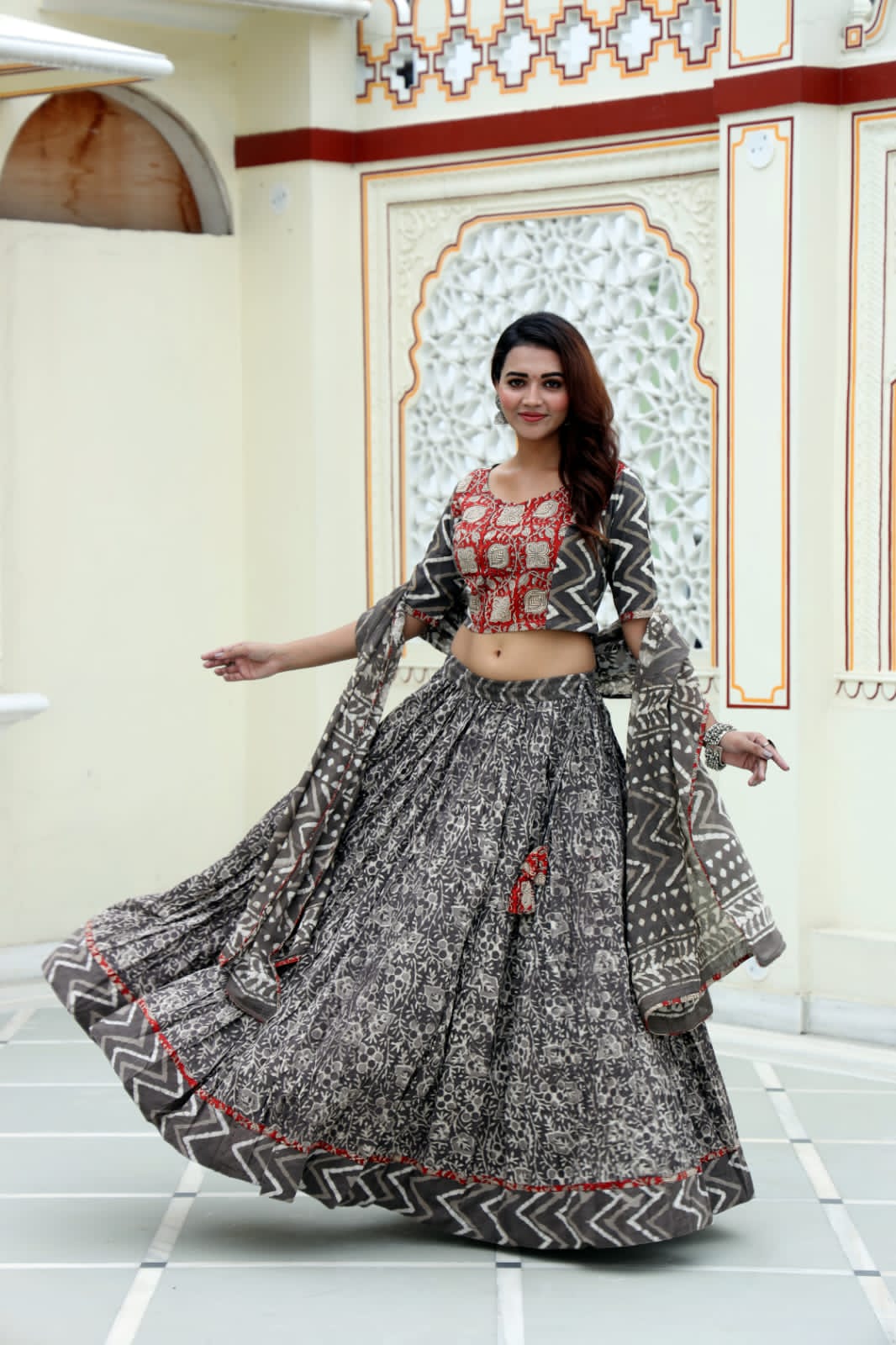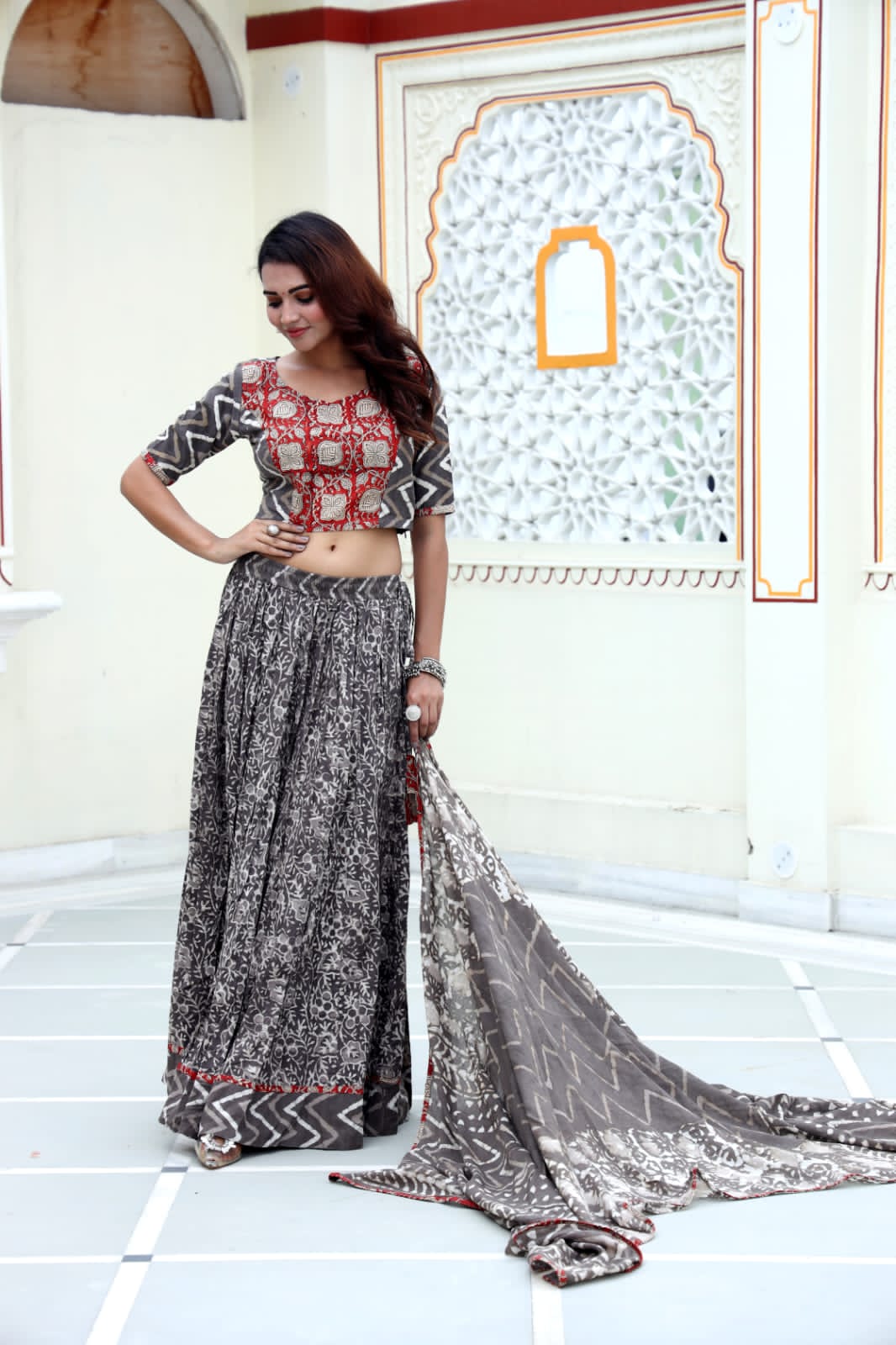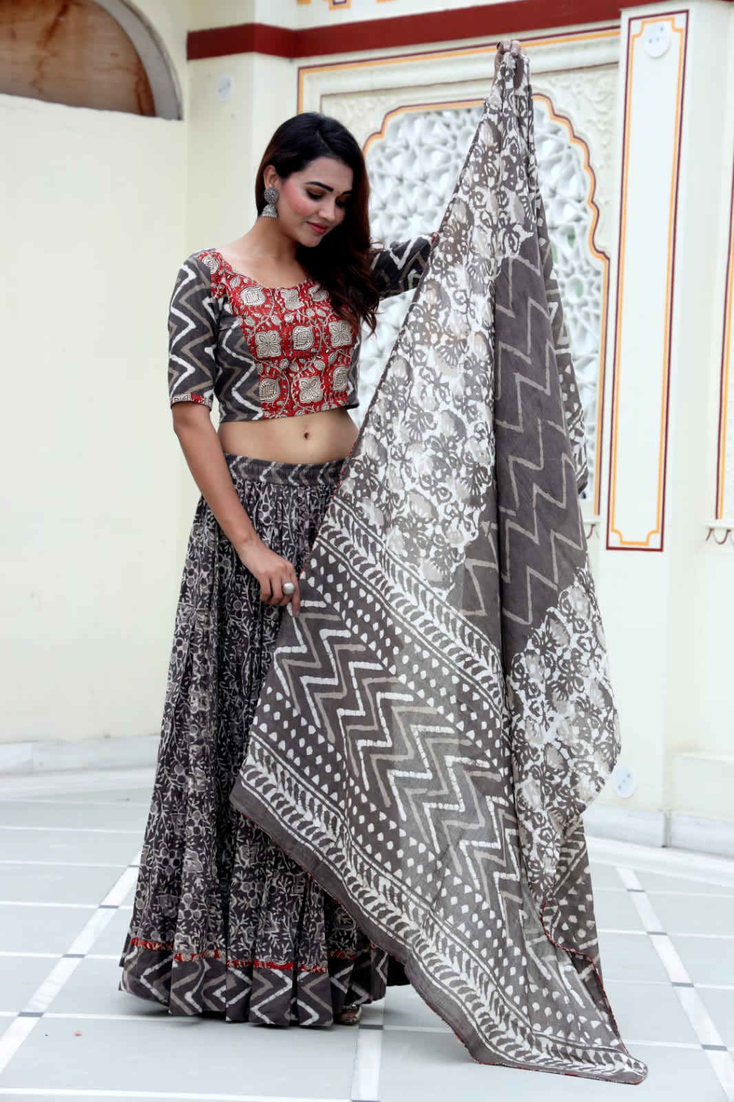 Mul mul cotton Lehenga set grey and white in Block printed designs and detailing