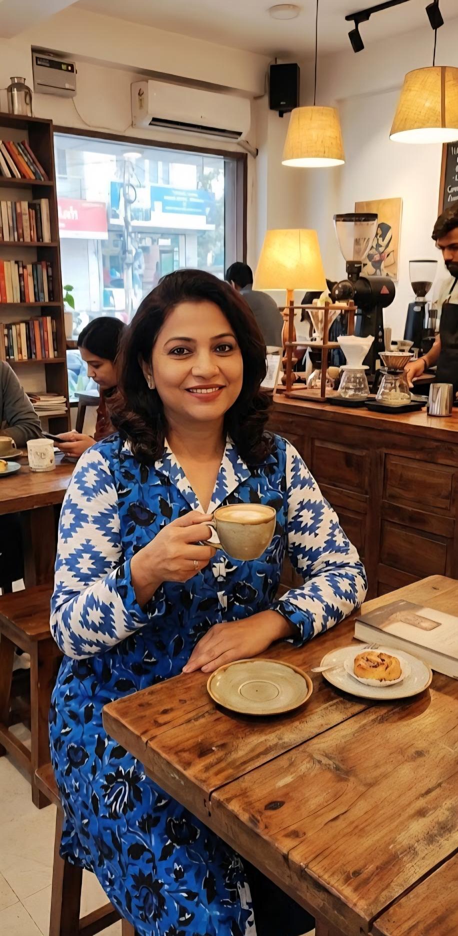 The body features a rich, deep blue botanical print that draws the eye, while the sleeves and collar offer a striking contrast with a crisp, white and blue geometric ikat pattern. The result? A silhouette that is both modern and timeless.