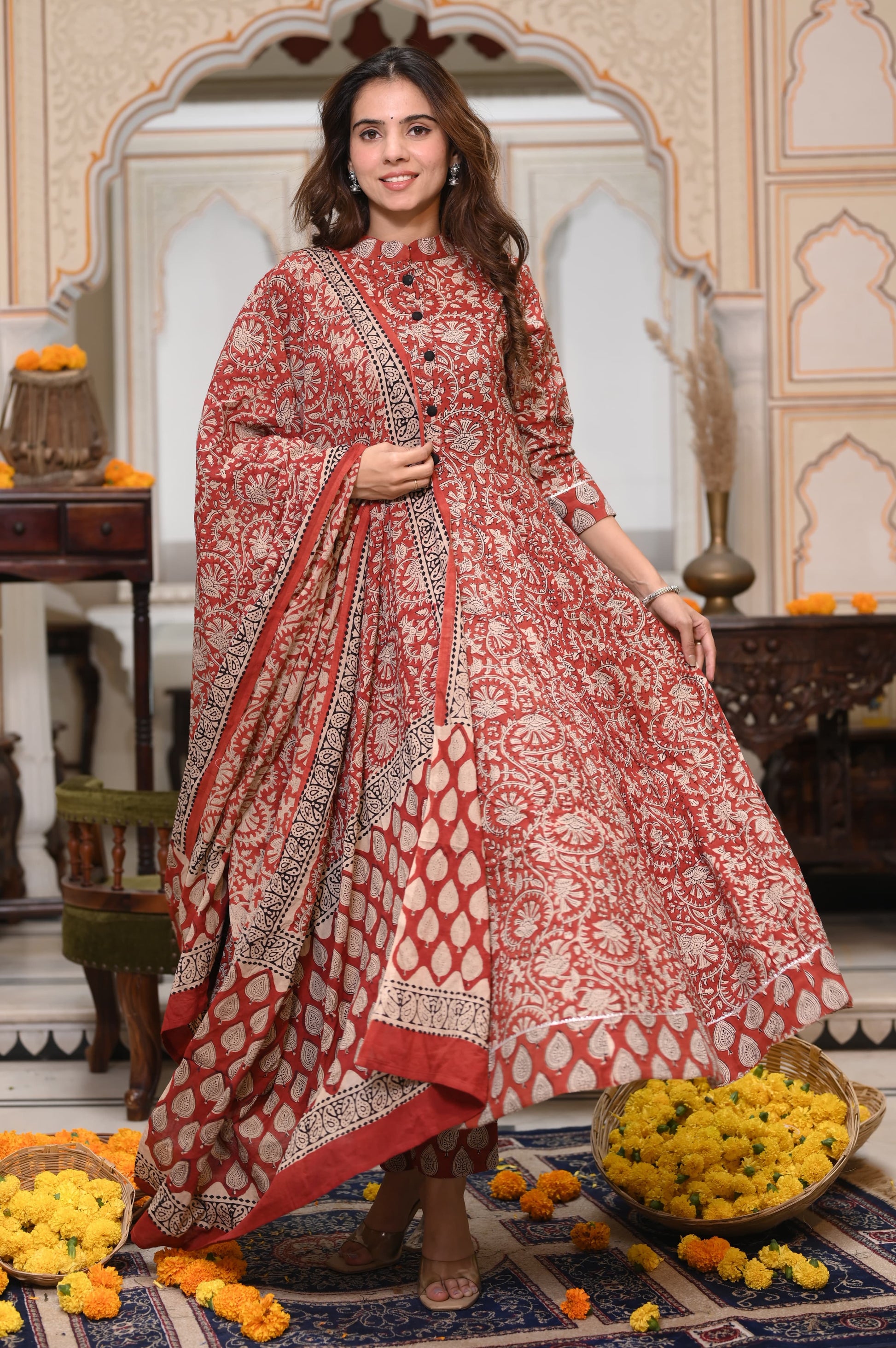 Brick red Ajrakh Mul Cotton Anarkali Suits
