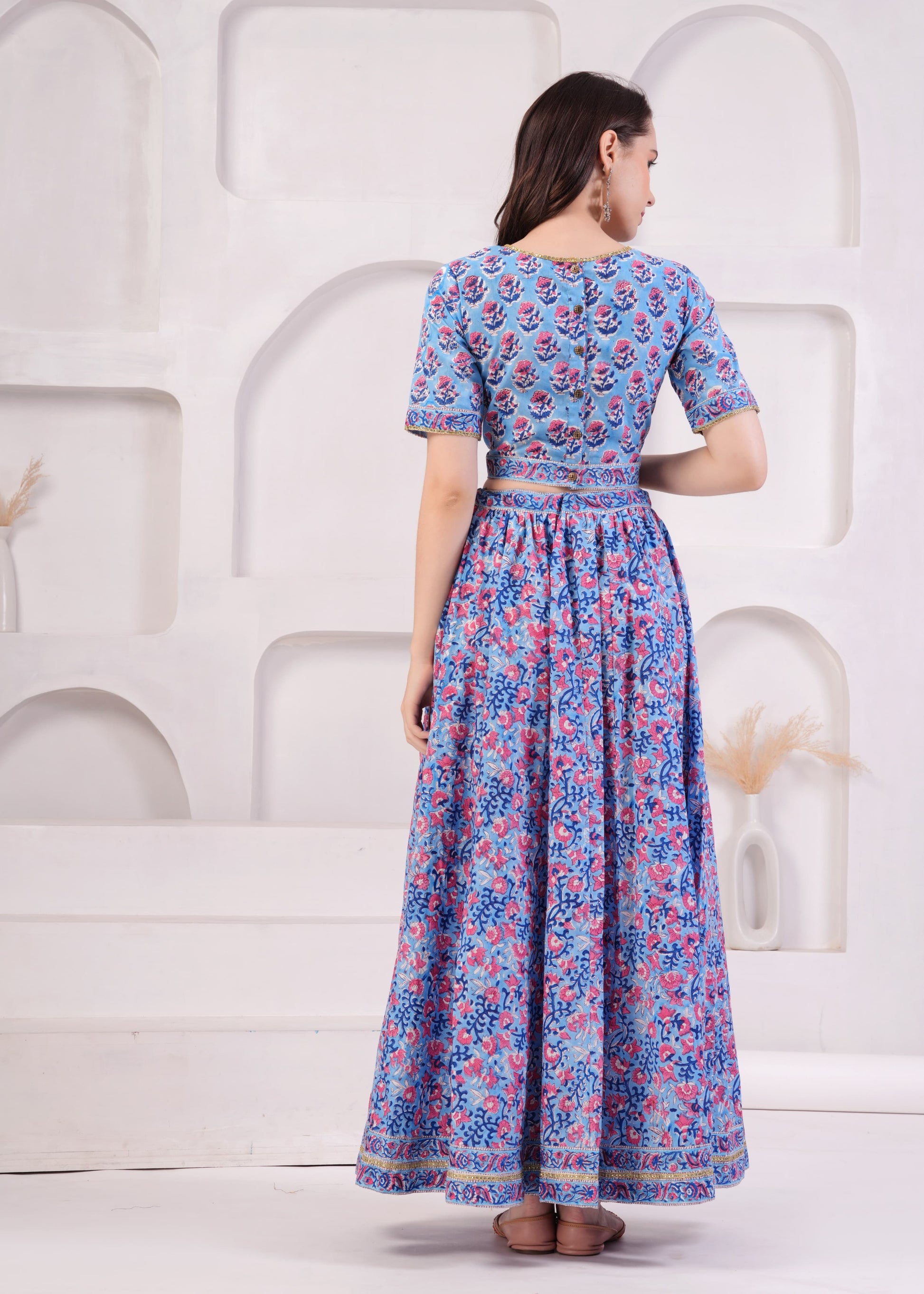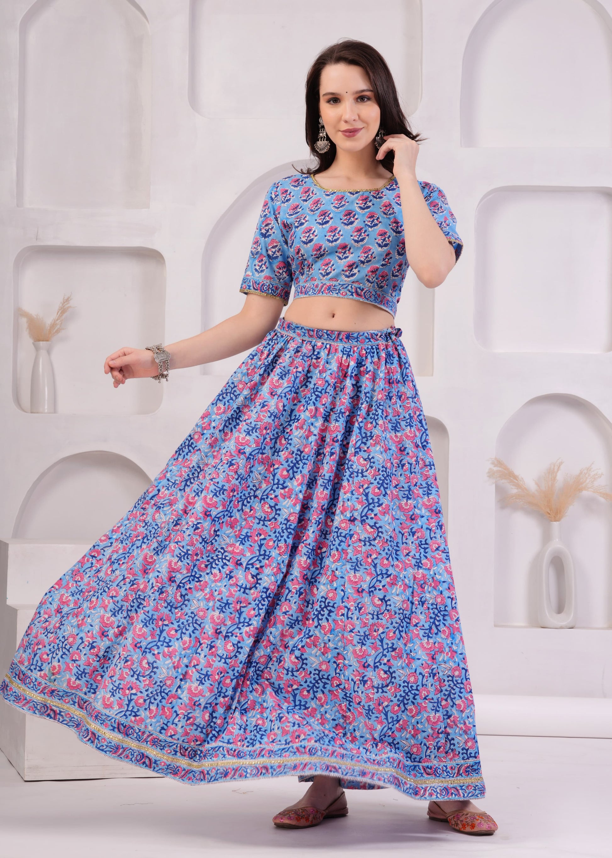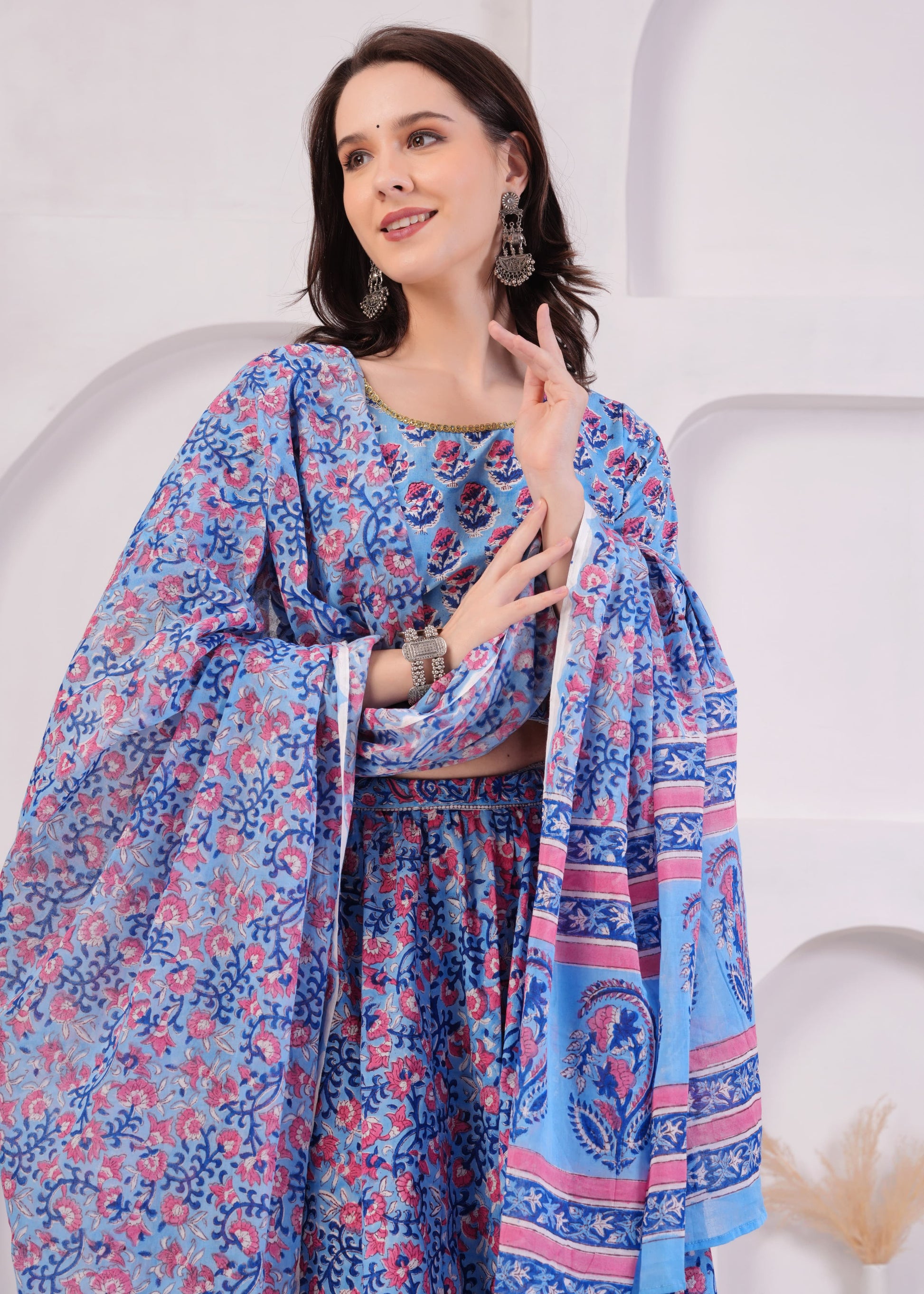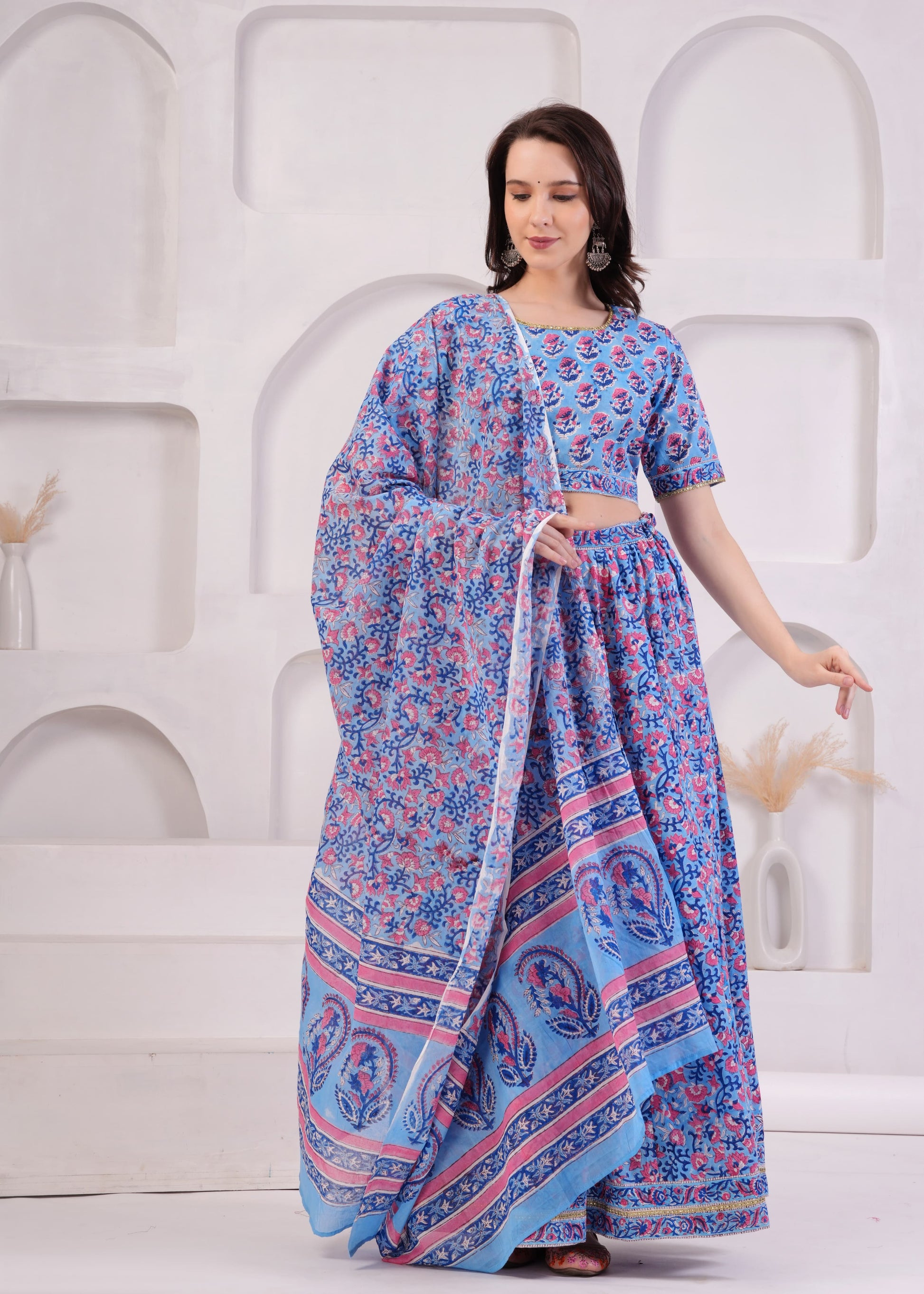Indulge in the luxurious elegance of our Mul Mul Cotton Lehenga set. Crafted from premium indigo-colored cotton, featuring a sophisticated block printed design, this set is perfect for any formal occasion. Elevate your style with this exclusive piece and make a statement wherever you go.