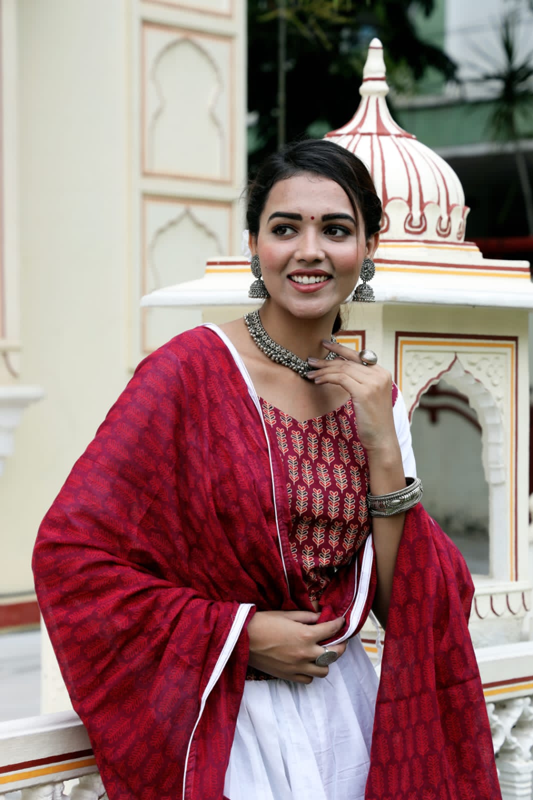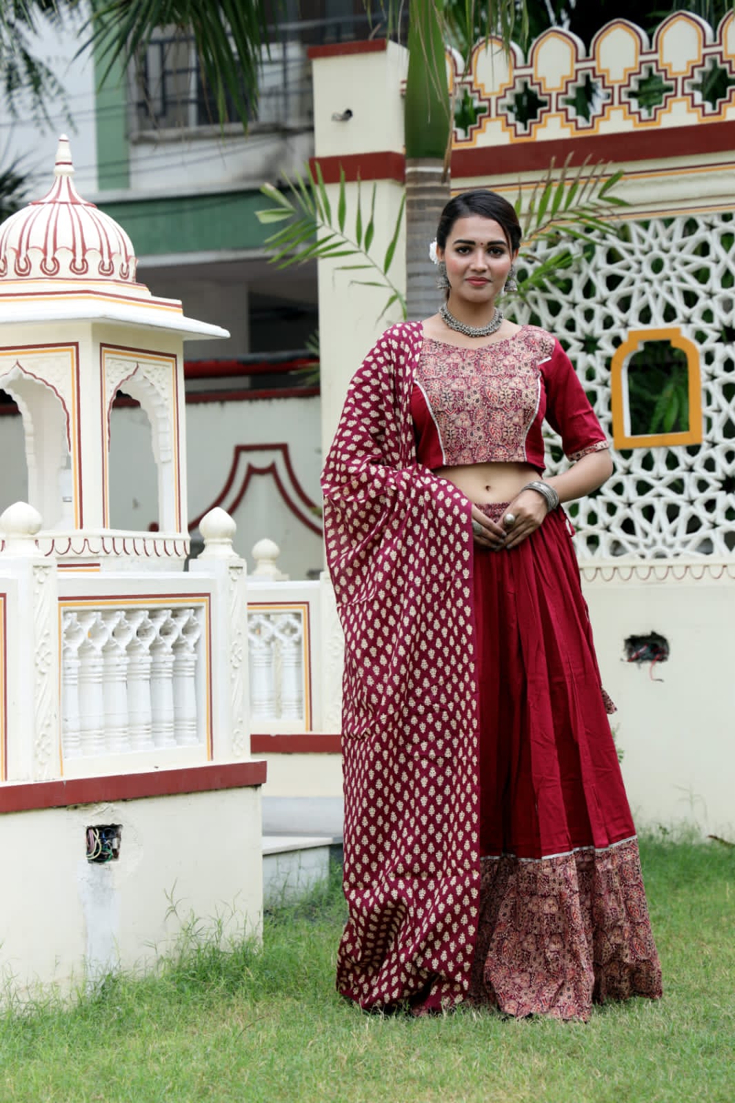 Mul mul cotton Lehenga set Crimson red shade in Block printed designs and detailing