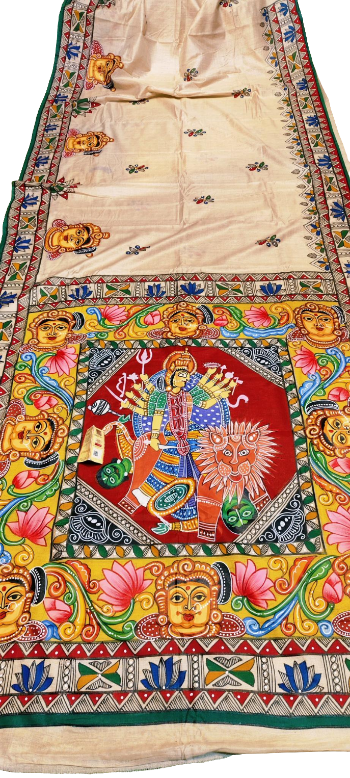 Pattachitra Durga handpainted tussar silk saree is a stunning work of art. Durga saree is painted by hand by skilled artists, resulting in a unique and intricate design. Made of luxurious Tussar silk, this saree is not only beautiful but also lightweight and comfortable to wear. Add a touch of elegance and tradition to your wardrobe with this folk painting mural Durga saree.Exquisite Durga Mural Tussar silk saree is meticulously hand painted, showcasing the highest level of craftsmanship. Made from luxurious and Desi Tussar silk, this saree is unique and elegant look for any occasion. Exude confidence and sophistication in this one-of-a-kind piece. This divine saree features a handpainted Durga goddess depicting Mural Artwork on luxurious Tussar Silk. Showcasing expert craftsmanship and intricate detailing, it is a true work of art. Elevate your style with this unique and sacred piece.