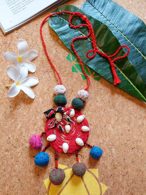 Indulge in fashion while being environmentally conscious with our Handmade Fabric Beaded Pendant Necklace. Made from zero waste fabric cutouts, each necklace is a unique piece that adds a touch of elegance. 100% handmade and adorned with beads, this necklace is a must-have for eco-friendly fashionistas.