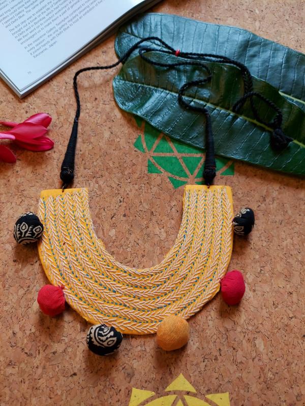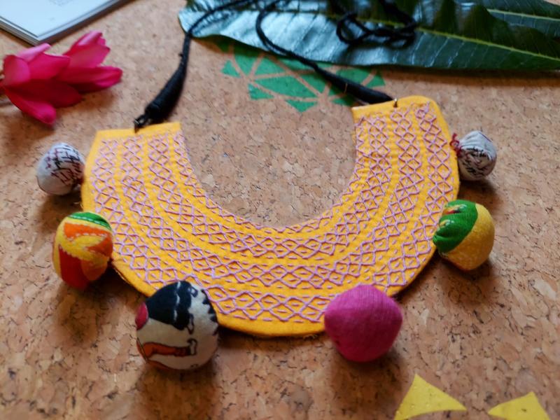 Indulge in fashion while being environmentally conscious with our Handmade Fabric Choker collar Necklace with Kantha stitched work and Beaded work. Made from zero waste fabric cutouts, each necklace is a unique piece that adds a touch of elegance. 100% handmade and adorned with beads, this necklace is a must-have for eco-friendly fashionistas.