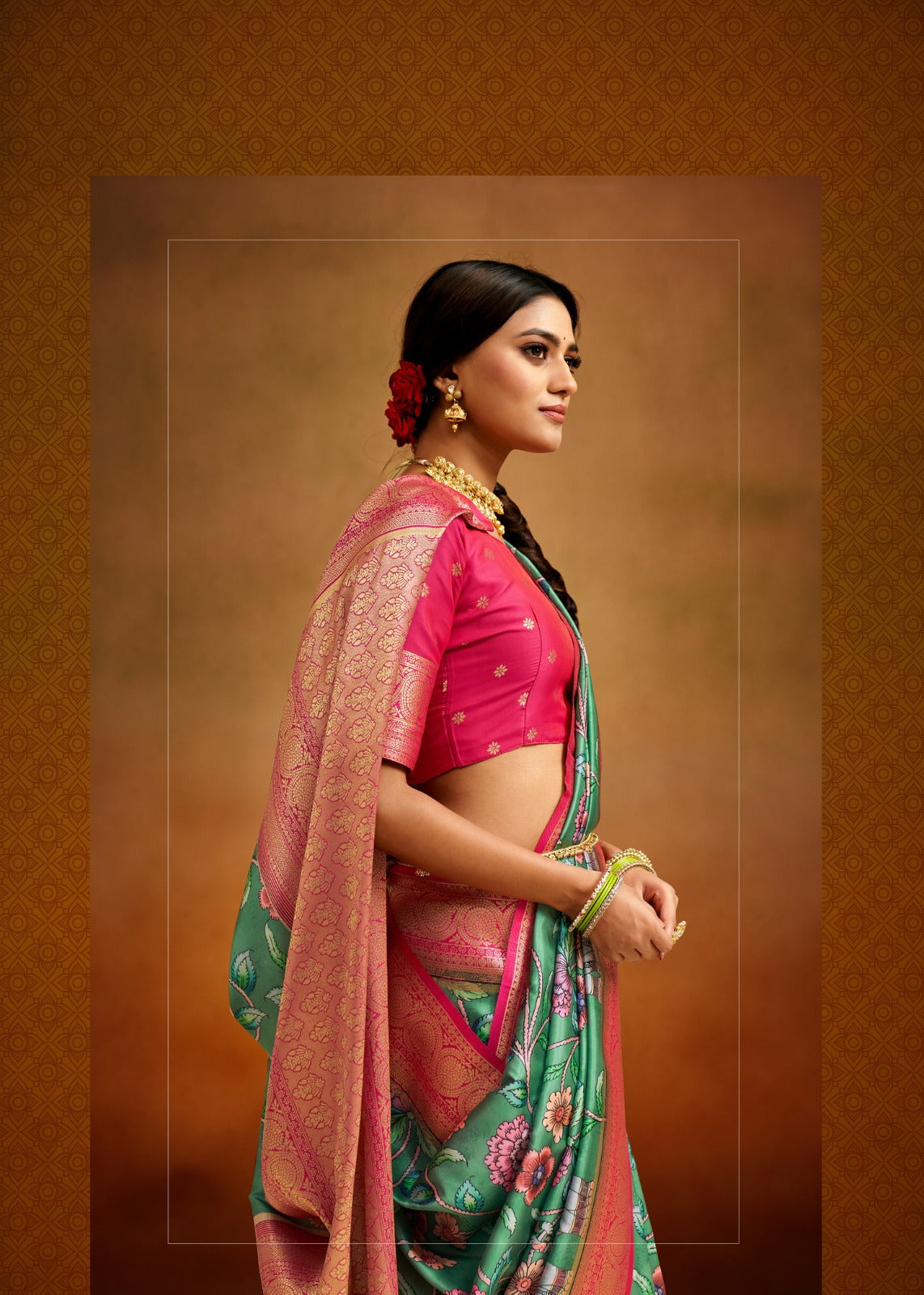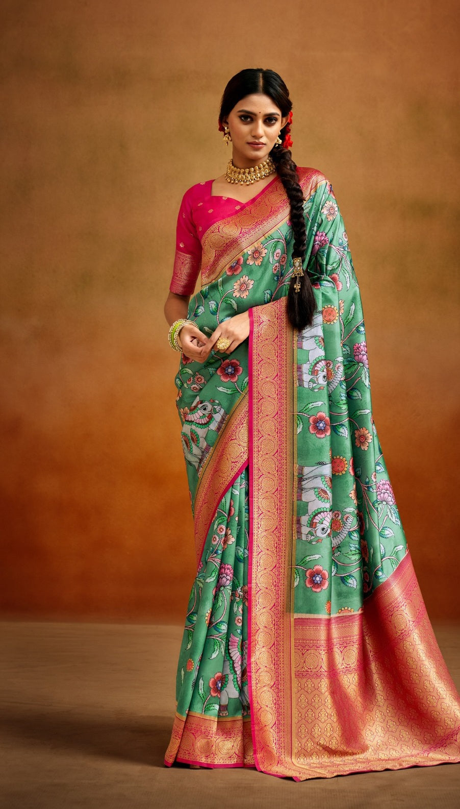 A Tussar Silk Kalamkari Elephant saree with a Banaras border is a stunning and unique piece of traditional Indian attire that combines the beauty of Tussar silk with Kalamkari printing and the opulence of Banarasi silk borders.