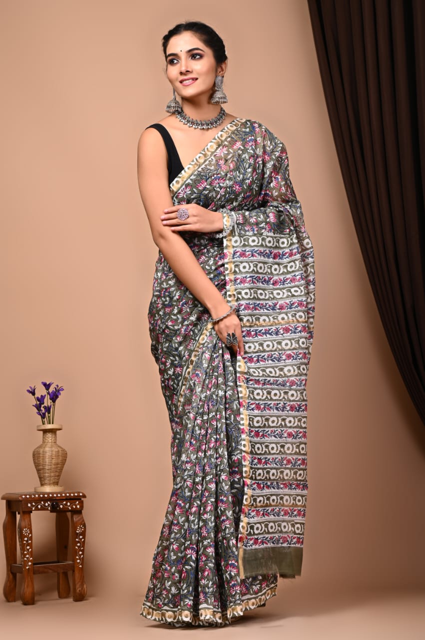 Experience the beautiful blend of traditional art and modern design with our Ajrakh block printed and lotus print chanderi silk saree. Made from high-quality silk, this saree features intricate prints and patterns that showcase our rich cultural heritage. Elevate your style game with this luxurious and timeless piece.