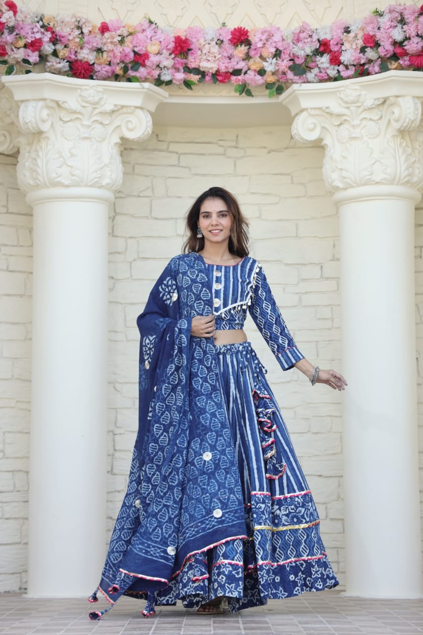 Indigo Mul Cotton Lehenga set with Block printed designs and detailing