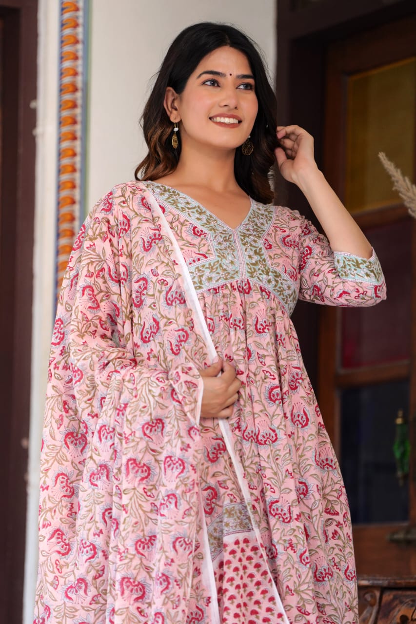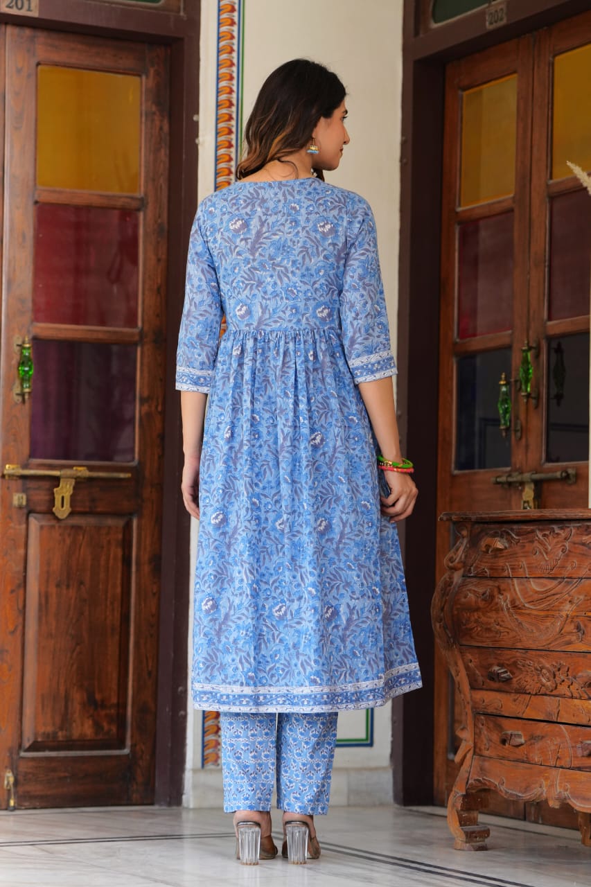 Handblock printed cotton suits are traditional Indian clothing made from cotton fabric that has been adorned with intricate designs using a handblock printing technique. This artful process involves creating patterns on wooden blocks and then transferring these patterns onto the fabric through careful printing. Handblock printing is a craft that has been practiced in India for centuries and results in beautiful, unique textiles. Cotton suits typically consist of three pieces: a long tunic-style top (kameez), bottoms (salwar or churidar), and a matching dupatta.