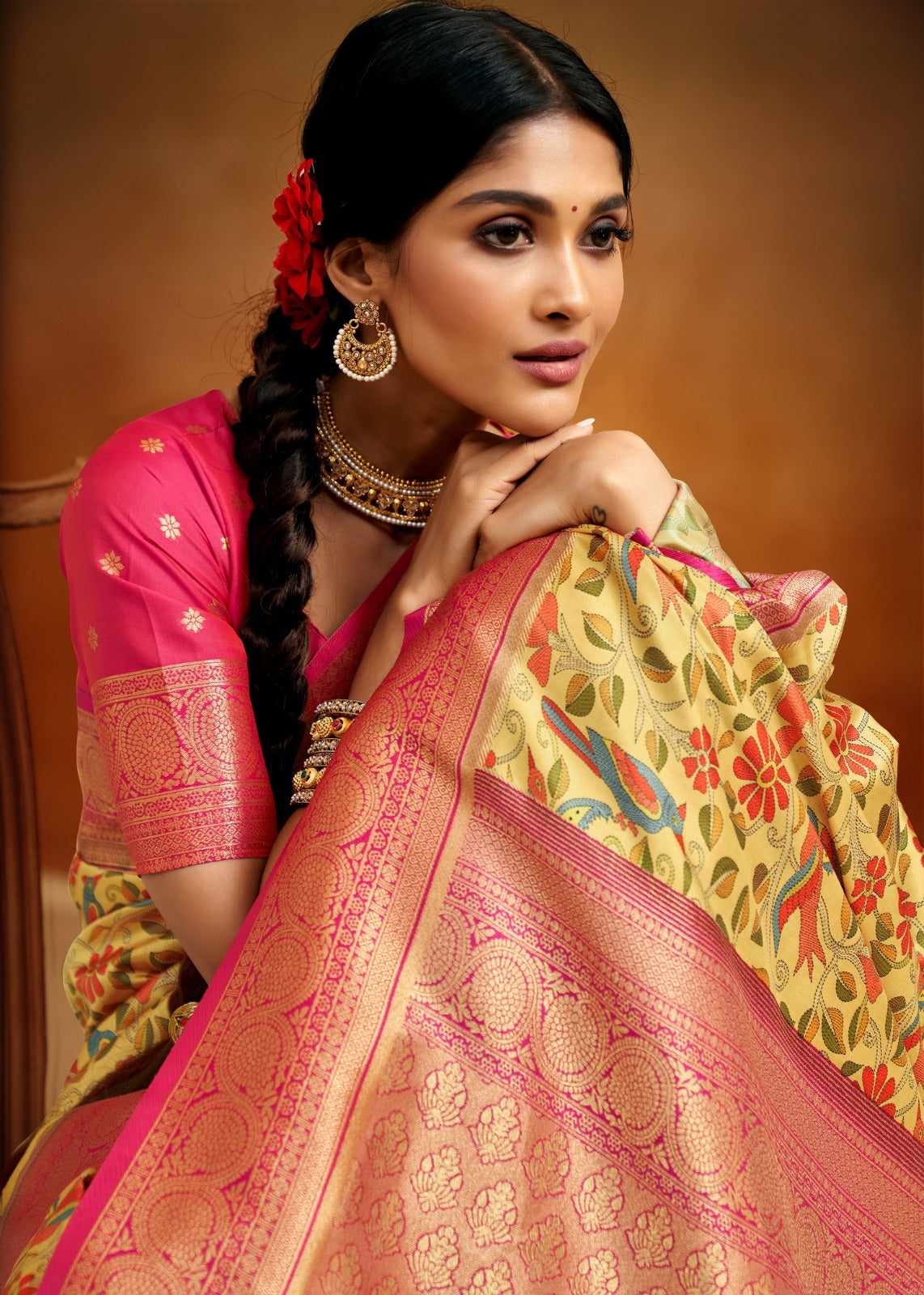 A Tussar Silk Kalamkari saree with a Banaras border is a stunning and unique piece of traditional Indian attire that combines the beauty of Tussar silk with Kalamkari printing and the opulence of Banarasi silk borders.