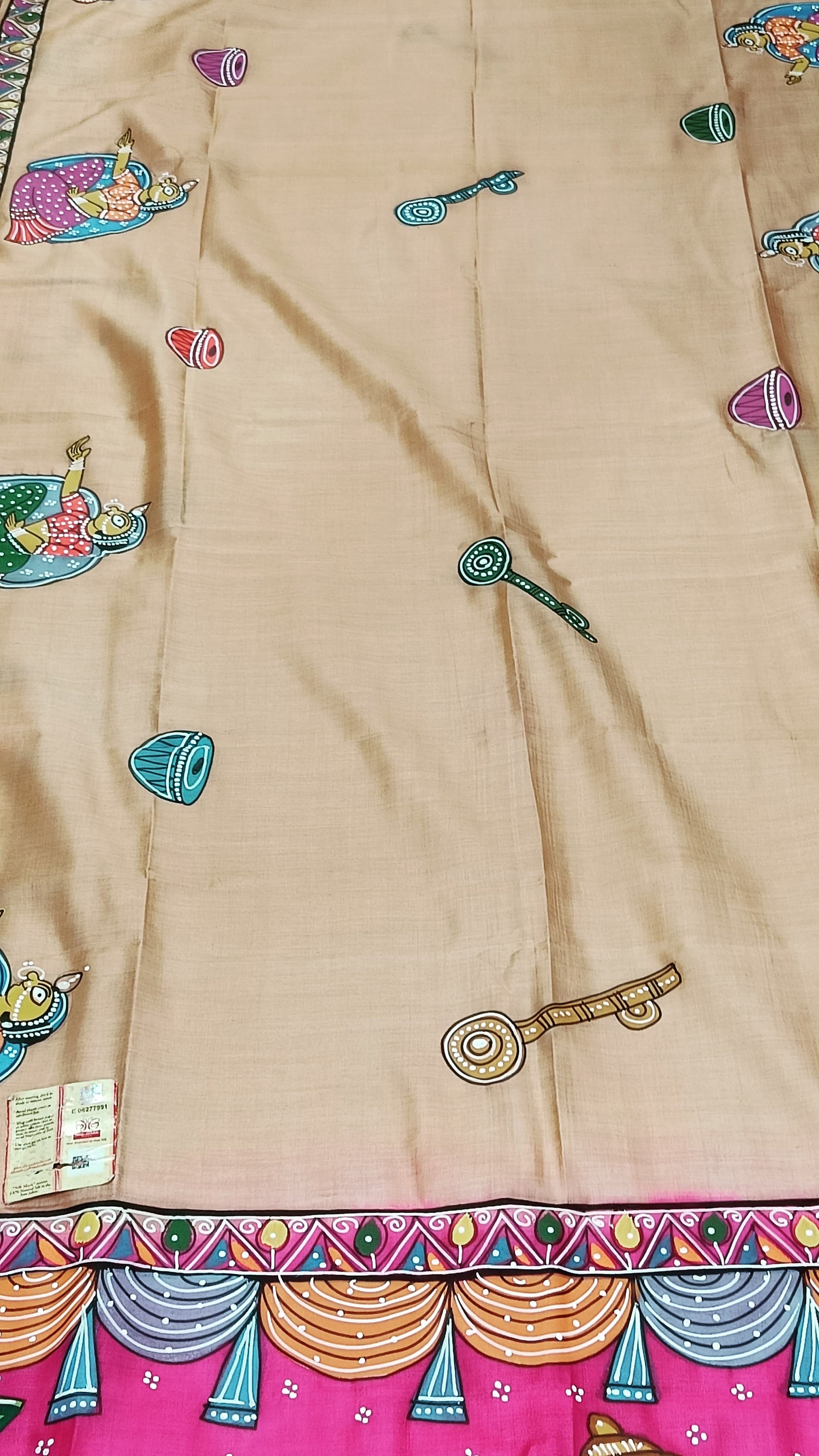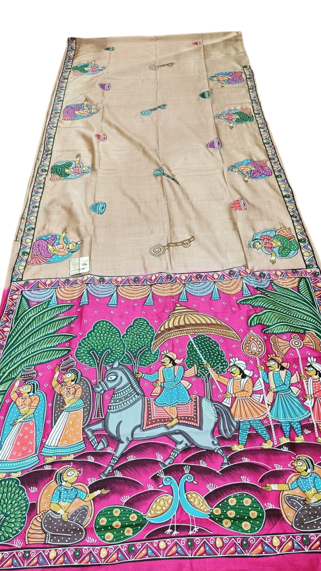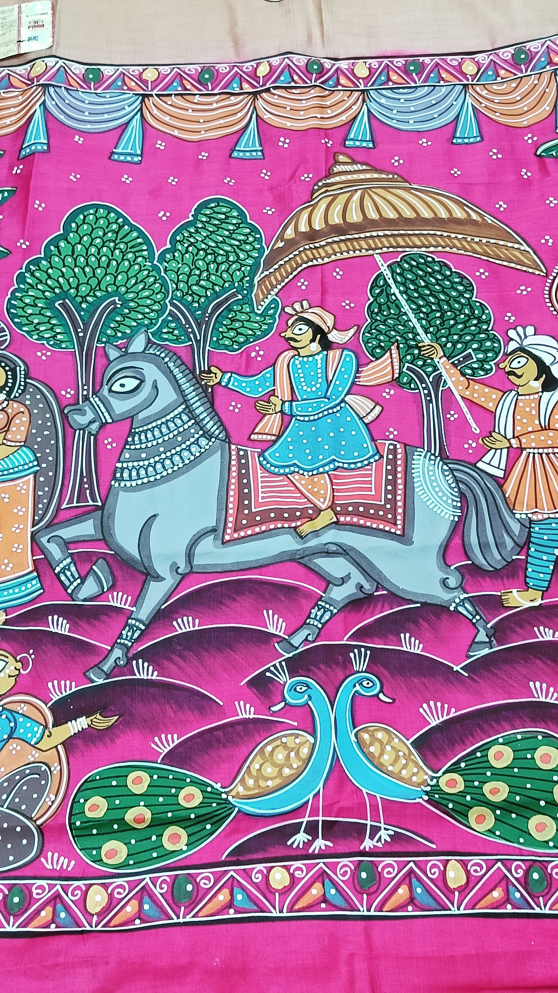Beaurifully Handpainted Phad Folk art on Bishnupuri Silk saree.