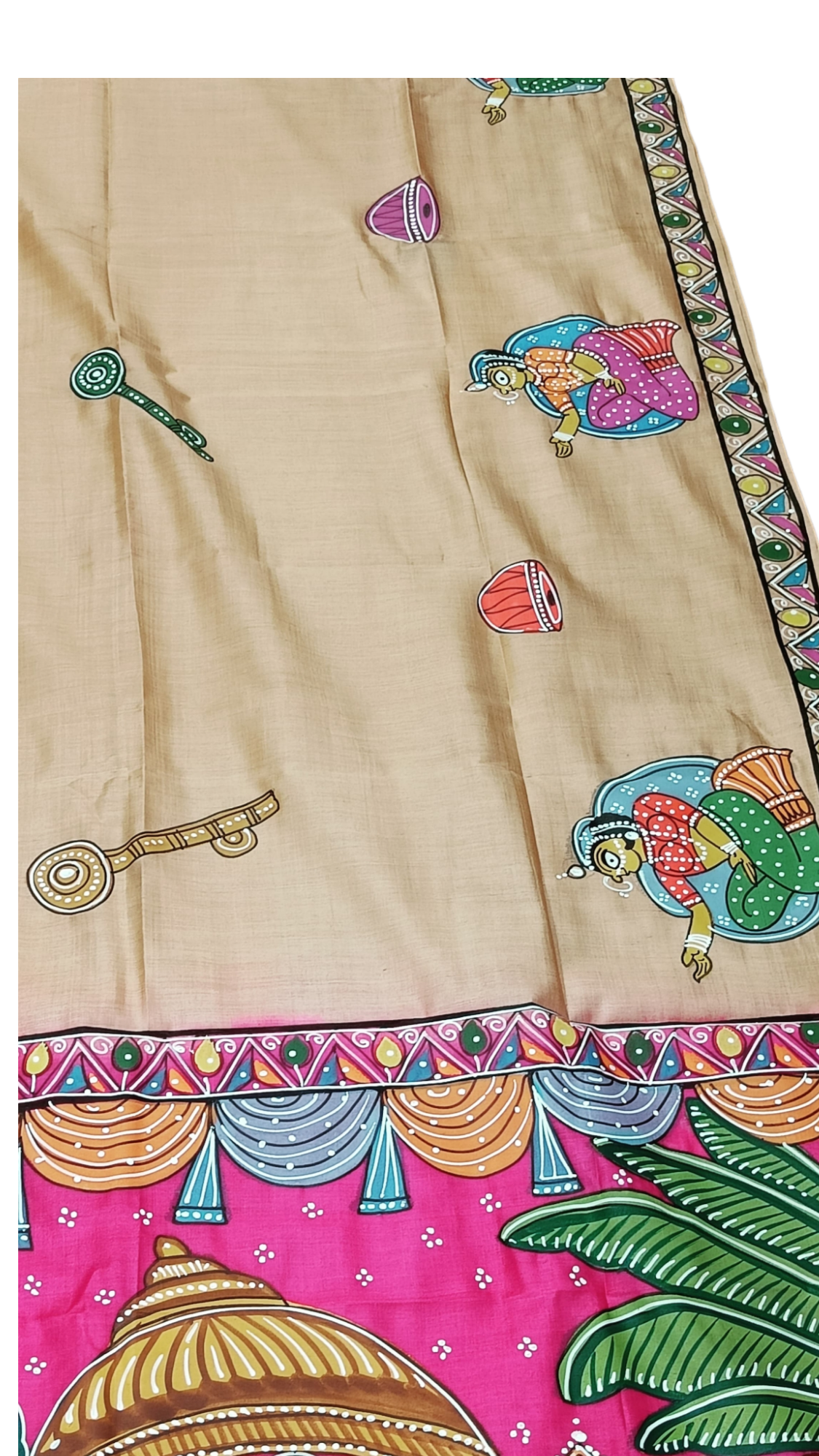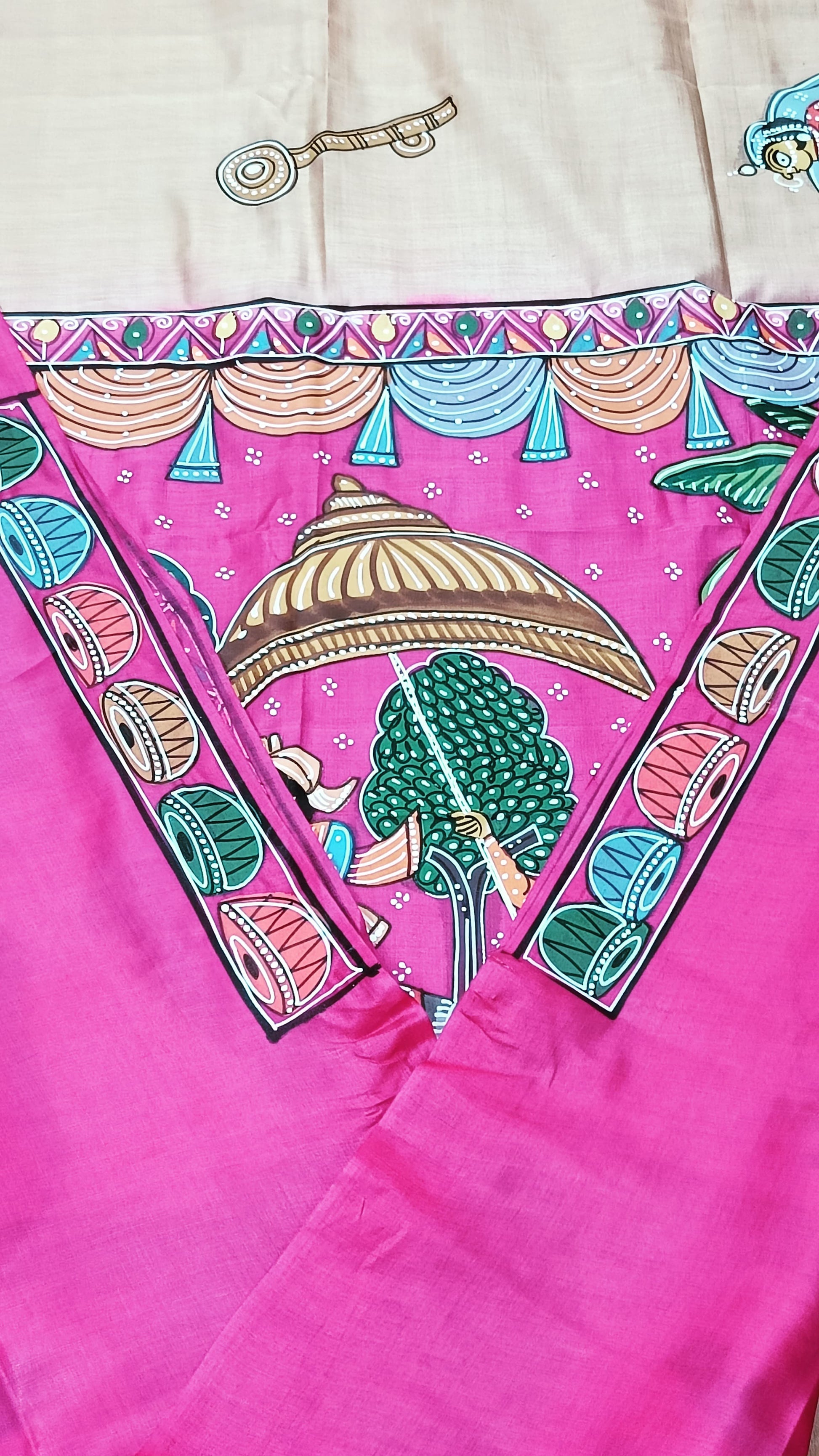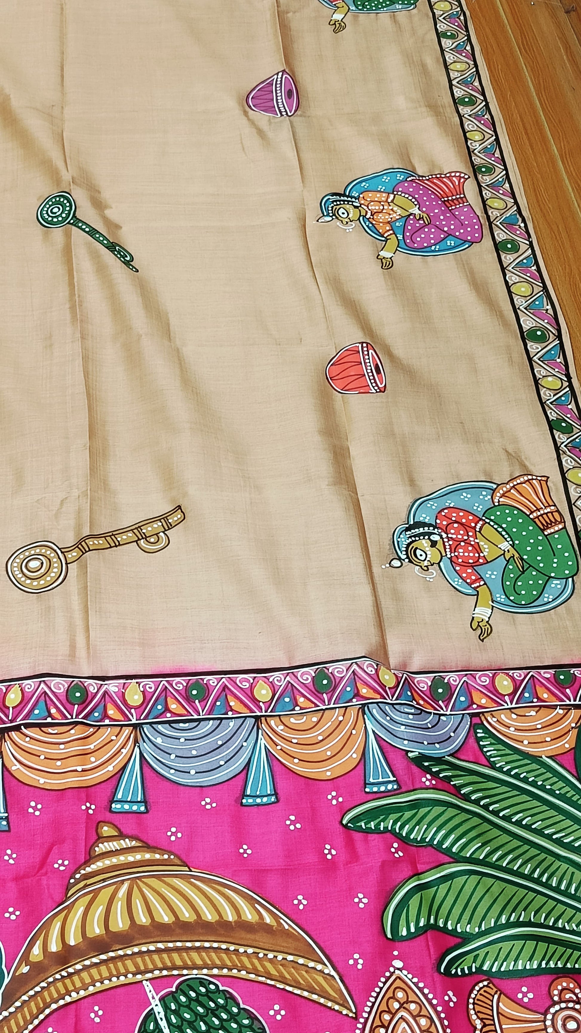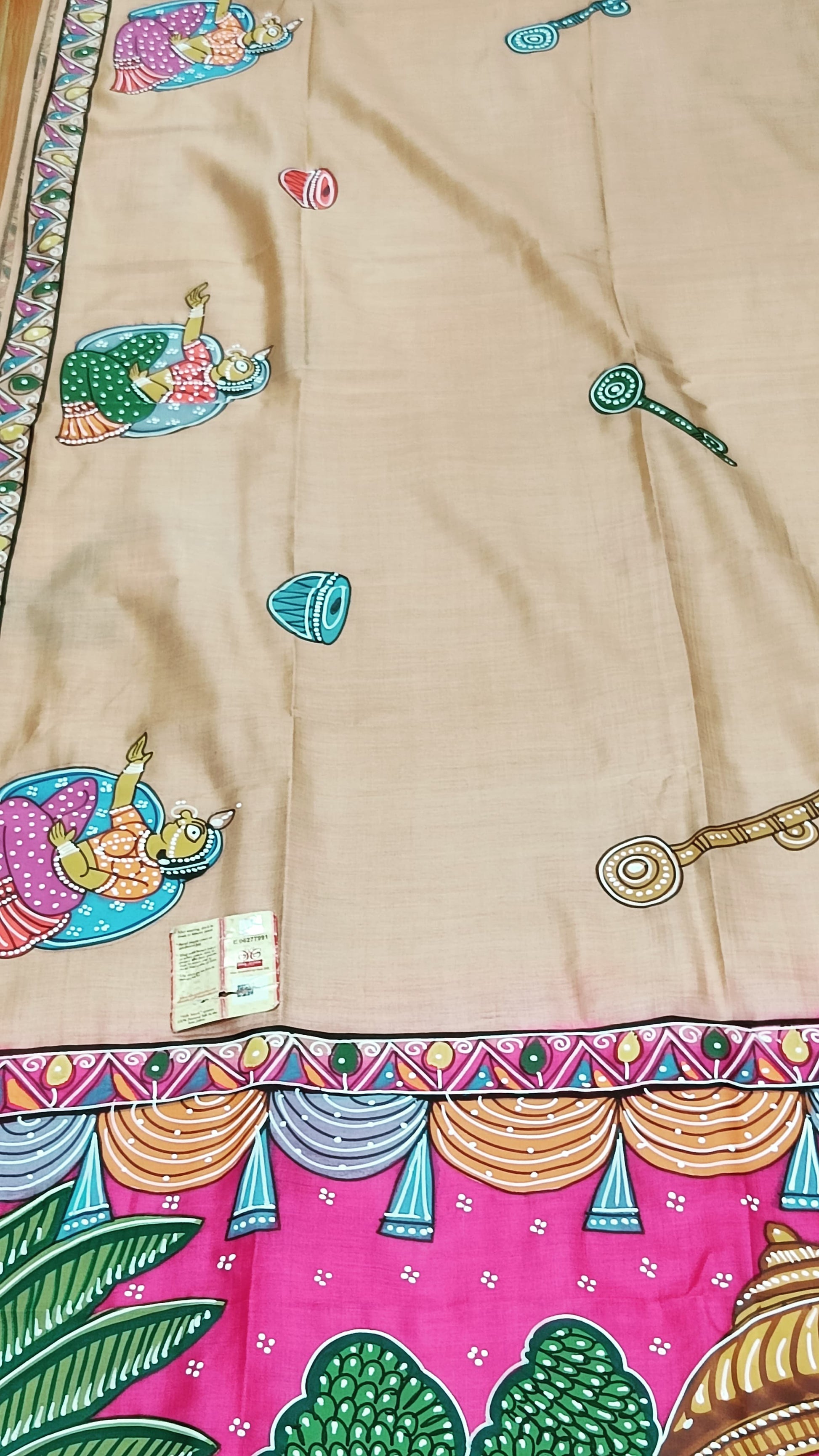 Beaurifully Handpainted Phad Folk art on Bishnupuri Silk saree.