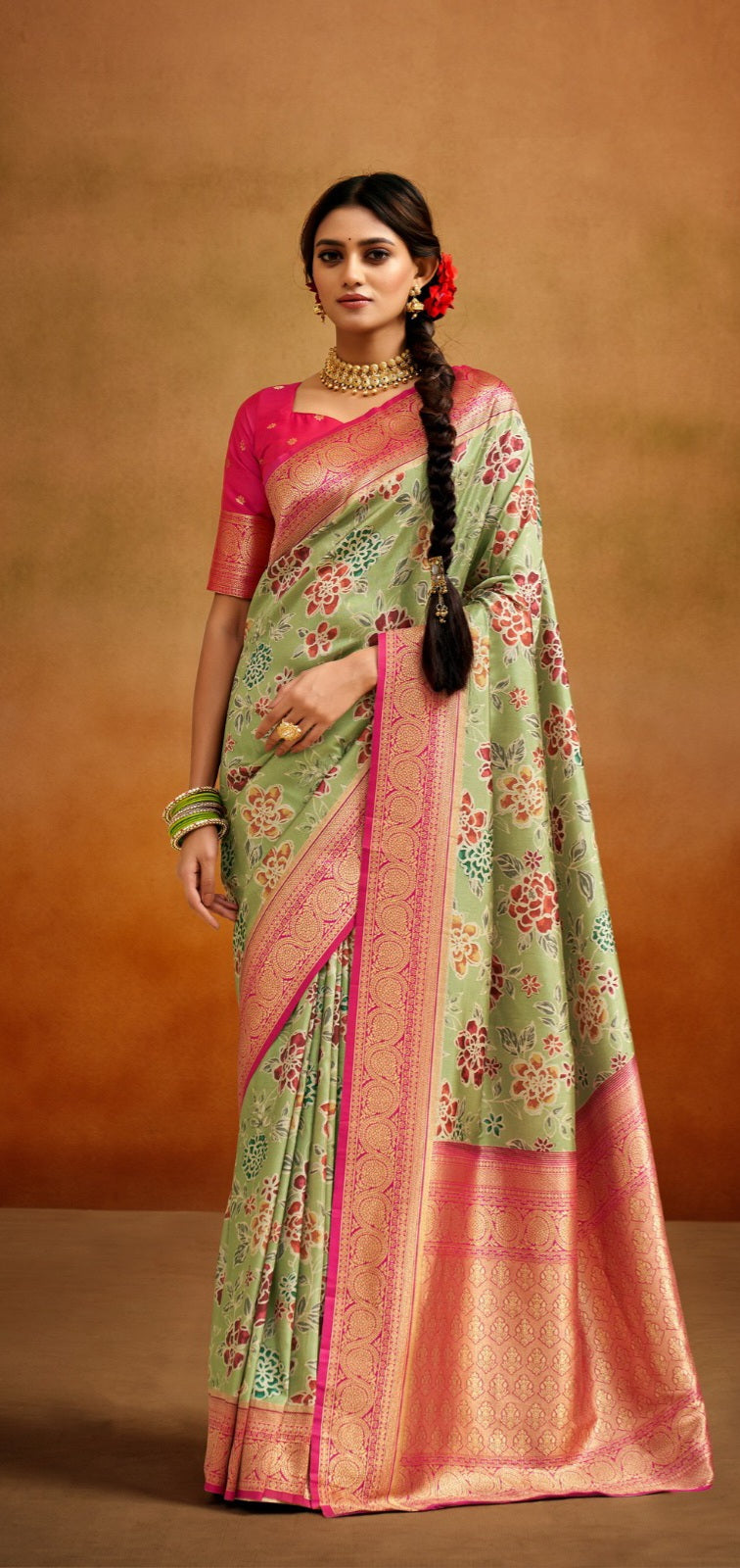 A Tussar Silk Floral saree with a Banaras border is a stunning and unique piece of traditional Indian attire that combines the beauty of Tussar silk with floral printing and the opulence of Banarasi silk borders.