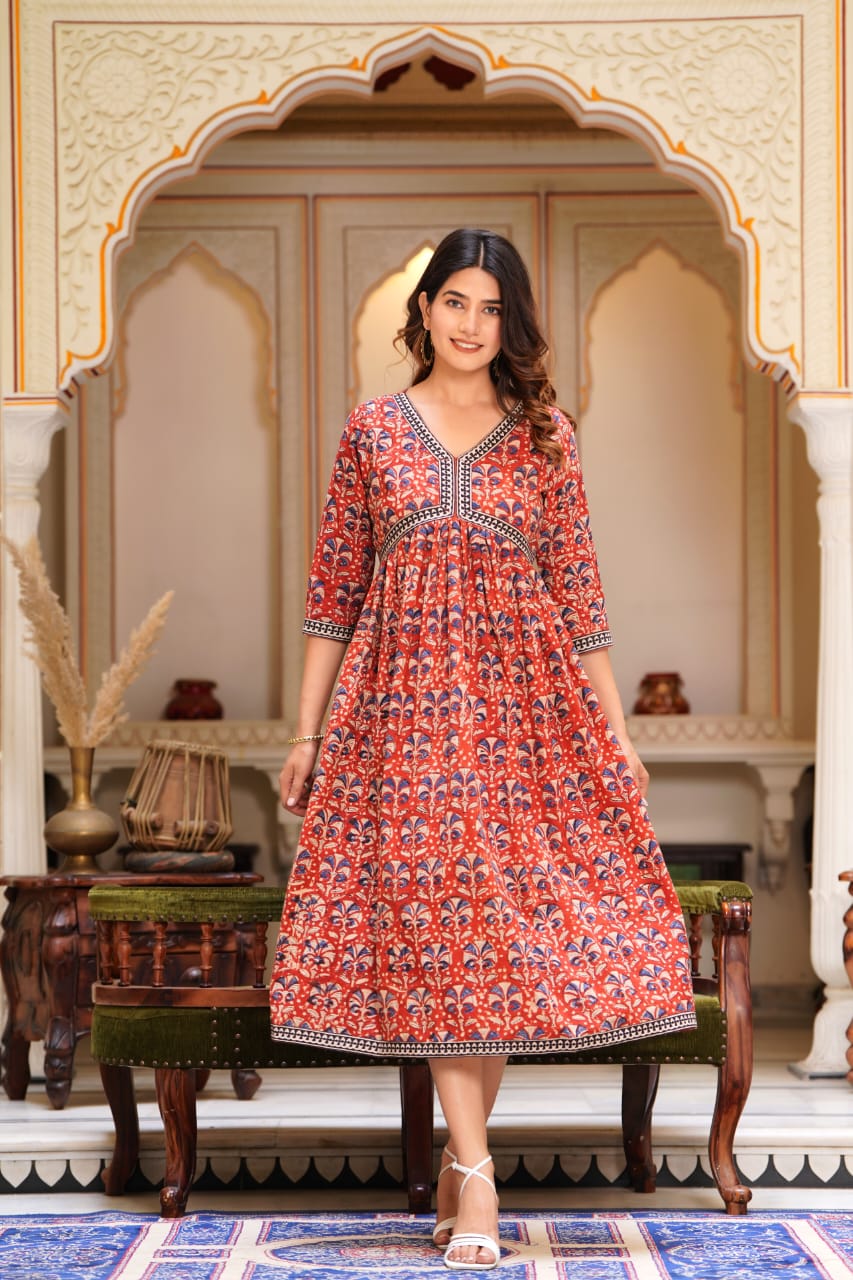 Hand Block Printed Pure Organic Cotton Naira Cut V Neck Gathered Dress with palm tree block print