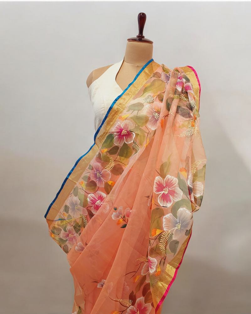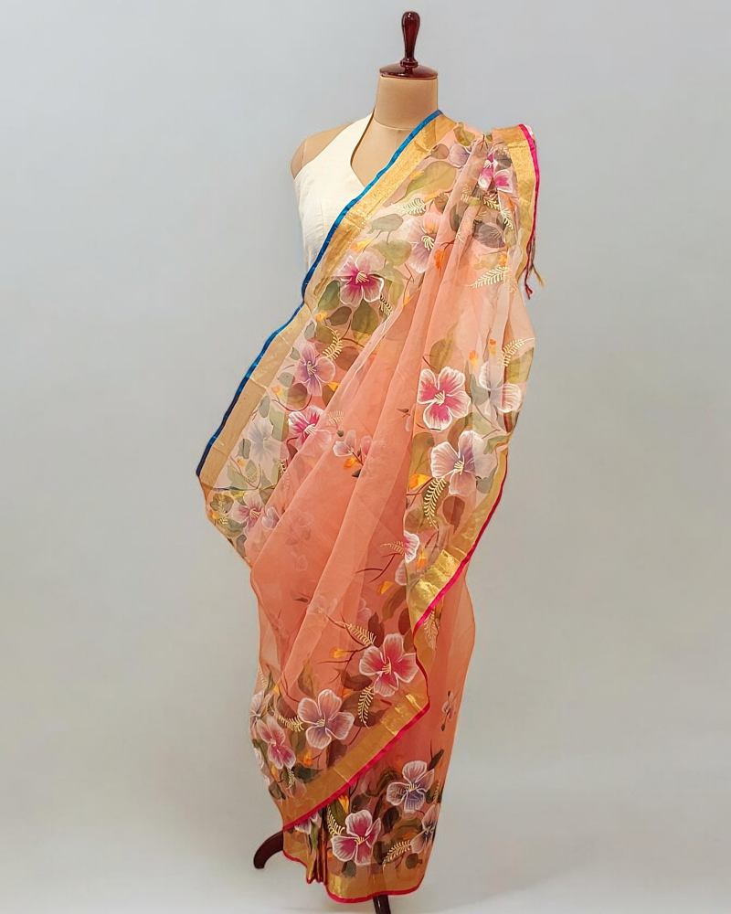 Shop this exquisite hand painted Floral Peach Resham Silk Muslin Saree. Hand woven muslin silk, this saree features delicate hand painted floral designs in a beautiful peach base color. Light weighted texture saree will add a touch of elegance and charm to your ensemble.