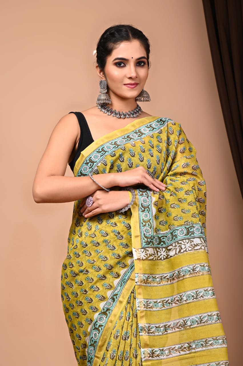 Yellow Floral block printed Chanderi Silk saree
